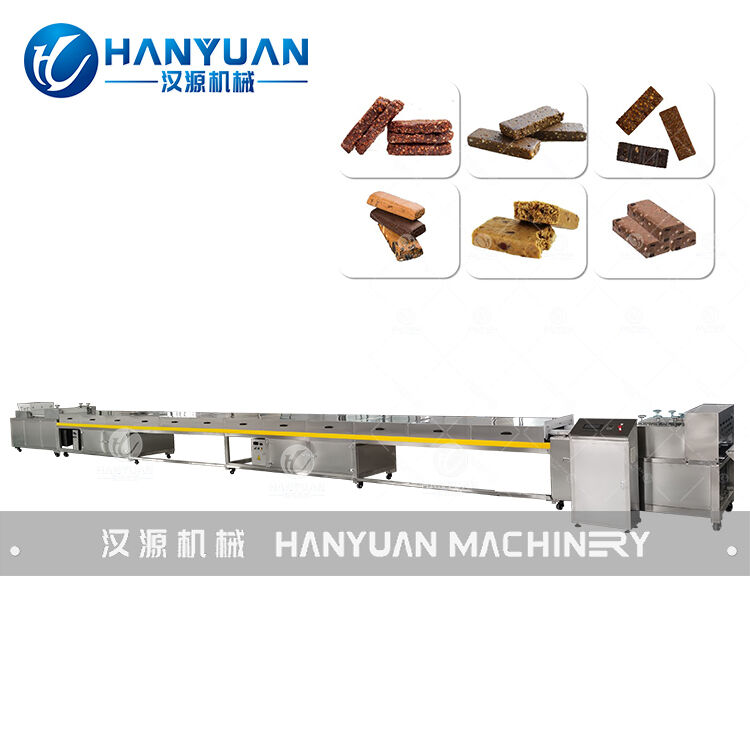 The HY-CL560 Cutting Machine with AC-cooling Function is a versatile food forming machine designed for producing long square food products. It is ideal for manufacturing cereal bars, energy bars, protein bars, nougat cakes, nougat caramel treats, and other sticky food items. This comprehensive system consists of five integrated components: feeding hopper, multi-roller compressing unit, AC-cooling tunnel system, cutting mechanism, and cooling conveyor.
