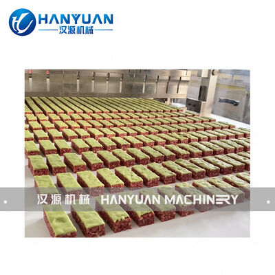 HANYUAN's High-protein Protein Bar Production Line is designed for industrial production of protein bars, dates bars, and muddy flesh bars. The line covers cooking & mixing of adhesive materials, forming & pressing, AC-cooling, ultrasonic cutting, metal detection, and pillow inner packaging.