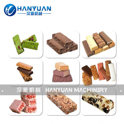 HANYUAN's Nuts Energy Bar Production Line is designed for industrial production of energy bars, nuts bars, and cereal bars. The system covers the complete process from melting and weighing adhesive materials to weighing dry materials, automatic mixing of dry and adhesive materials, forming, cooling, cutting, chocolate coating (full-coating or bottom-coating), decorating, and pillow inner packaging.