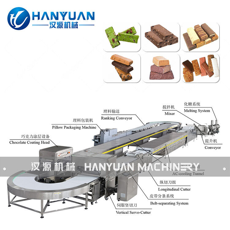HANYUAN's Nuts Energy Bar Production Line is designed for industrial production of energy bars, nuts bars, and cereal bars. The system covers the complete process from melting and weighing adhesive materials to weighing dry materials, automatic mixing of dry and adhesive materials, forming, cooling, cutting, chocolate coating (full-coating or bottom-coating), decorating, and pillow inner packaging.